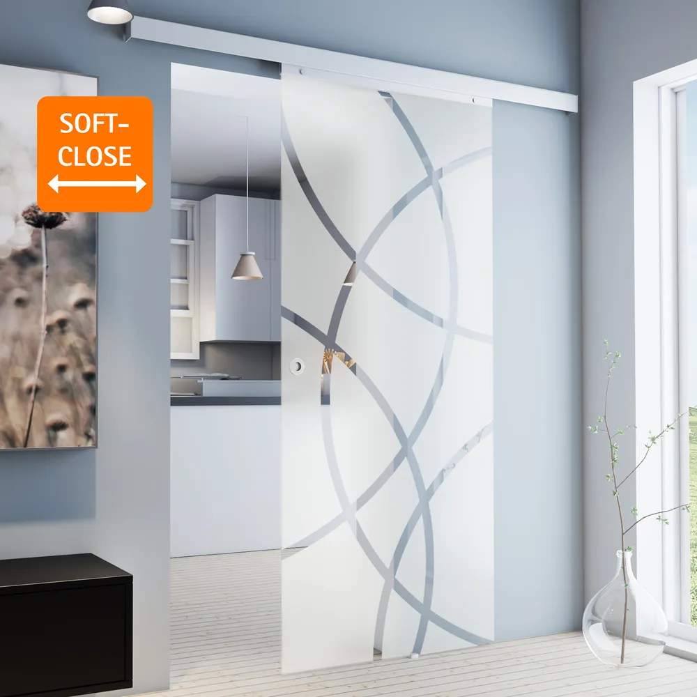 Porte coulissante intérieure en verre 88 x 203 cm, porte vitrée décor cercles, poignée ronde, double amortisseur Softclose
