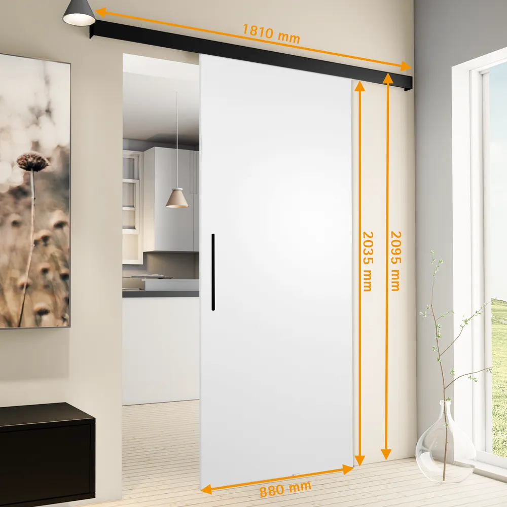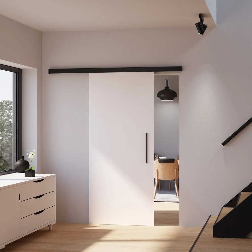 Porte coulissante intérieure, porte pleine, en bois blanc 88 x 203 cm, rail et poignée noirs