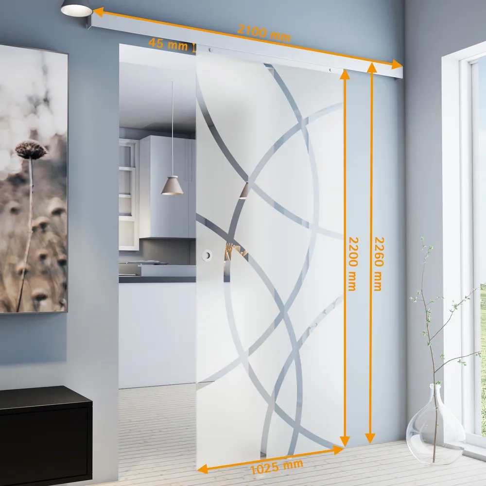 Porte coulissante intérieure en verre 102 x 220 cm, porte vitrée décor cercles, poignée ronde