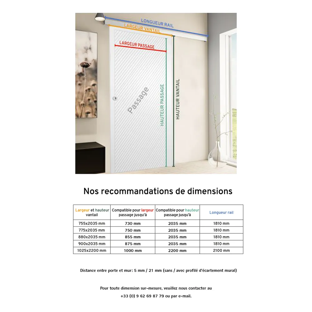 Porte coulissante en bois, 77x206cm, porte intérieure pleine, bois blanc, rail apparent noir