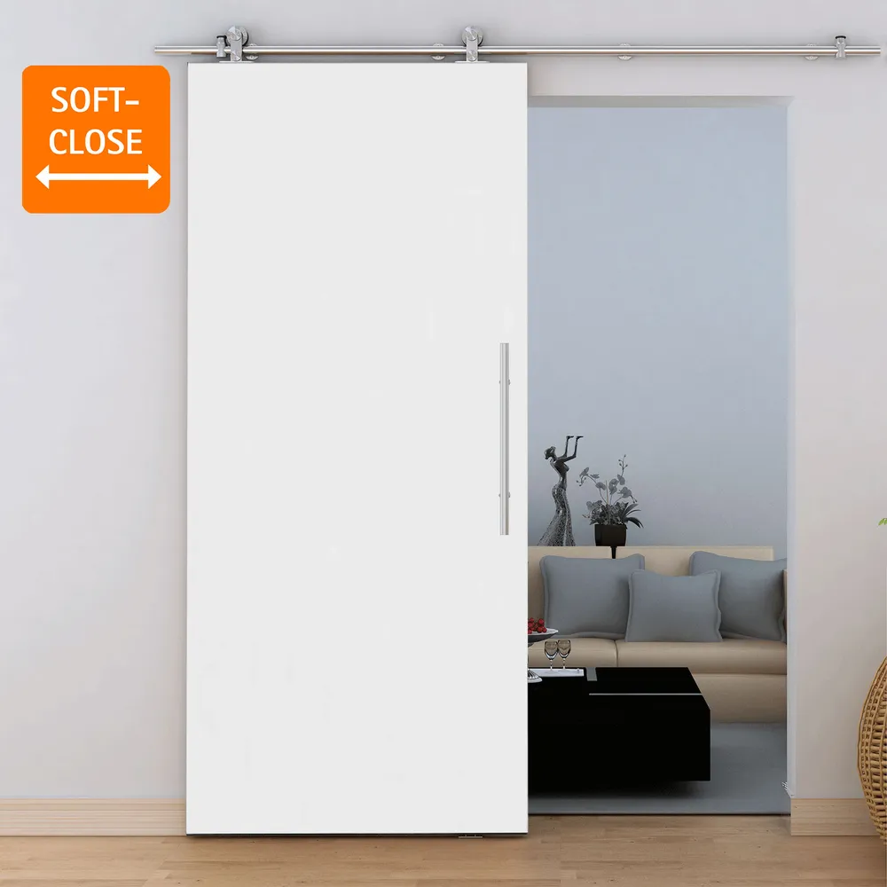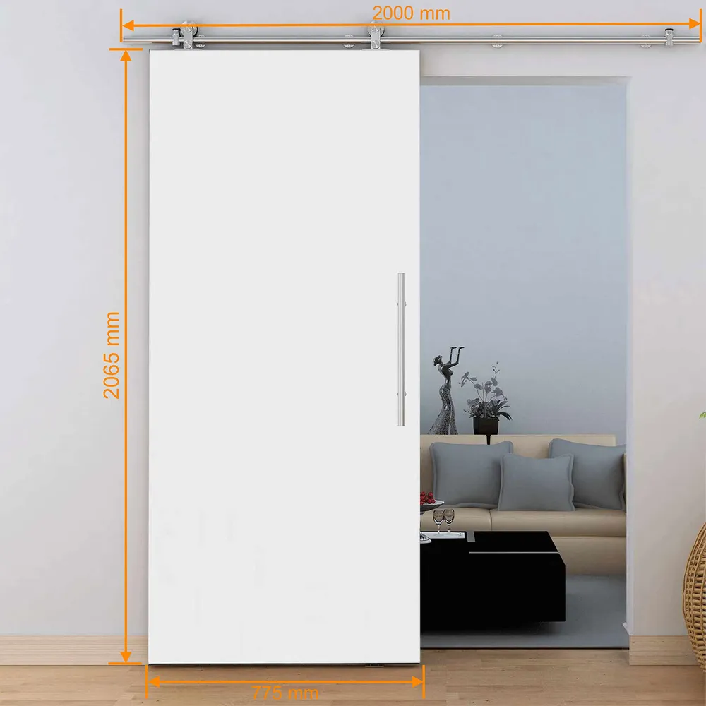 Porte coulissante en bois, 77x206cm, porte intérieure pleine, bois blanc, rail apparent, poignée barre, double amortisseur Softclose