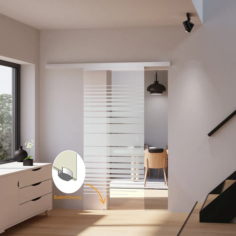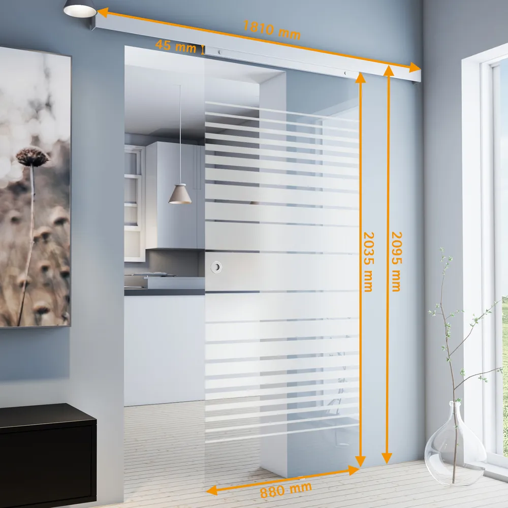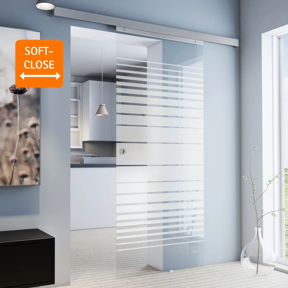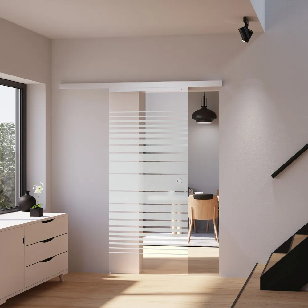 Porte coulissante intérieure en verre 88 x 203 cm, porte vitrée décor rayures opaques, poignée ronde, double amortisseur Softclose